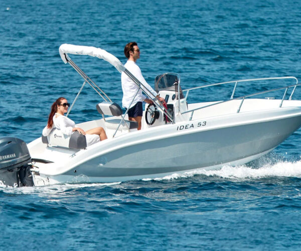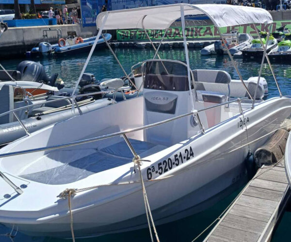Want to captain your own boat in Tenerife? The Idea 53 makes it easy—no boating license required! This stylish 5-meter Italian motorboat fits up to 6 people and is powered by a beginner-friendly 15 HP engine that’s simple to handle. Spend your day exploring hidden coves, spotting dolphins, or just cruising the stunning coastline at your own pace. Relax on the spacious bow sundeck, cool off under the bimini shade, and jump in for a swim whenever you want. Fuel is included, departing from Puerto Colón.