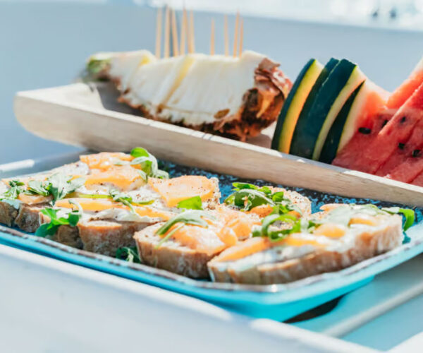 - Fresh baguettes, fruit, and snacks served on board
