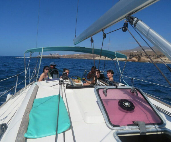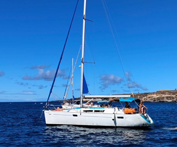 Experience authentic sailing aboard the elegant 12-meter Sun Odyssey 39i from Puerto Colón! This private 3-hour charter includes free hotel pickup from Costa Adeje, Playa Paraíso, Palm-Mar, and Los Cristianos (up to 8 passengers). Watch resident pilot whales in their natural habitat with official whale watching authorization. Enjoy relaxing sailing along Tenerife’s stunning volcanic coastline, followed by swimming and snorkeling stops. Feast on generous Canarian snacks (cheeses, local salami, hummus, olives, mojo sauce) and unlimited cold drinks (cava, wine, beer). Comfortable yacht features shaded roof, spacious cabins, hot water showers!